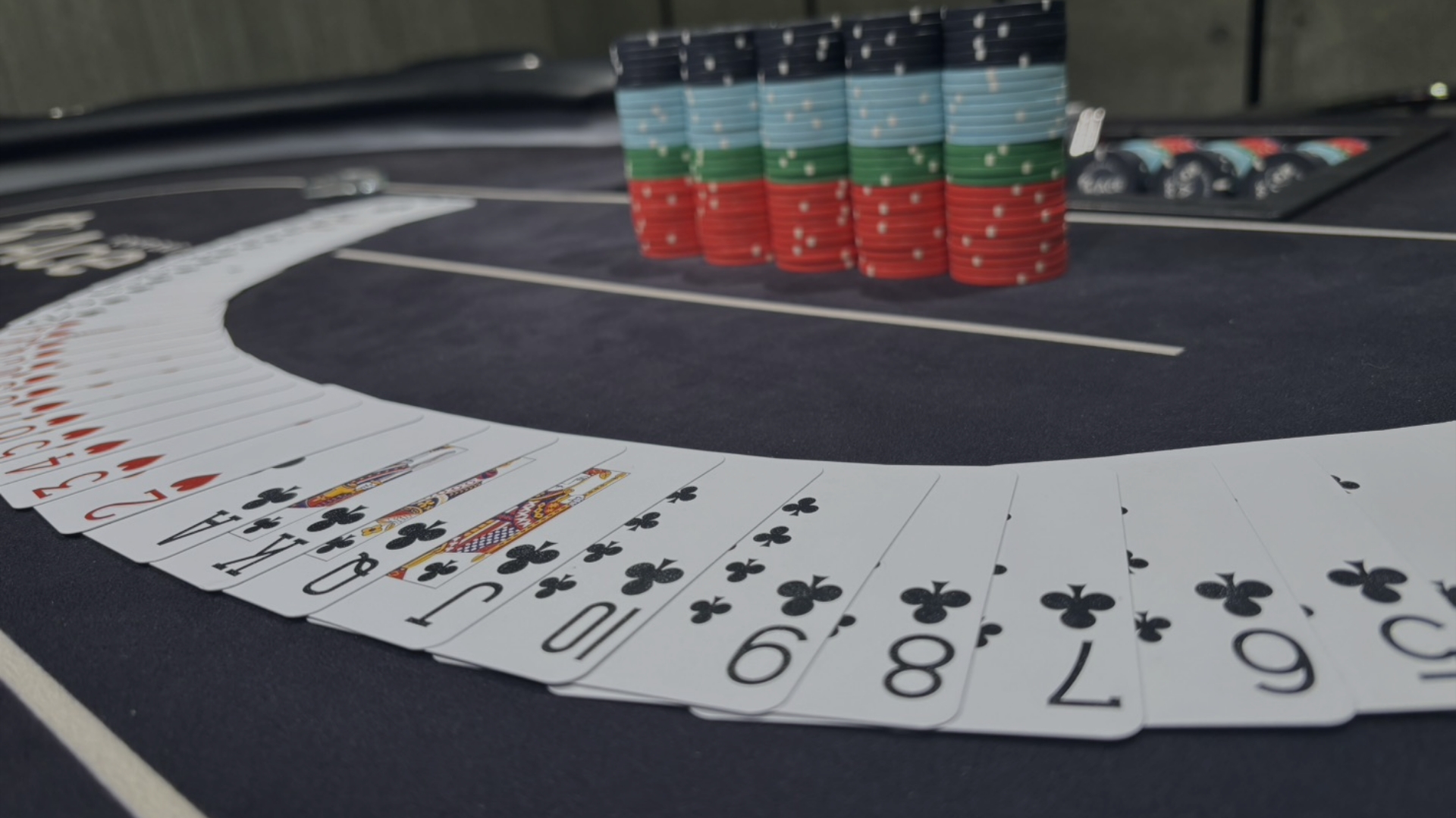 専用チップを埋め込んだトランプをテーブルのスキャナが読み込むことで、勝率やハンドを見ることができるため
